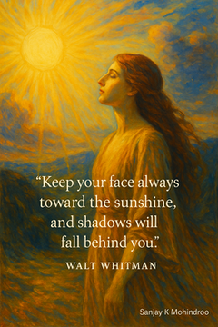 Walt Whitman once said, “Keep your face always toward the sunshine, and shadows will fall behind you.” This line carries a feeling that stays with you. It holds a quiet push. A clear call to look forward, not back. It speaks of hope without drama and strength without noise. The quote suggests that when we turn toward what lifts us, the weight we carry loses its form. That simple shift changes everything. #focus #growthmindset