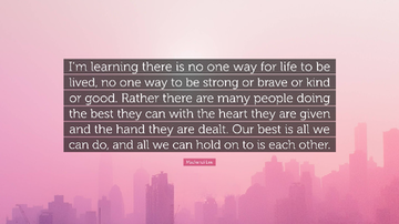 The quote, "I'm learning there is no one way for life to be lived, no one way to be strong or brave or kind or good. Rather many people are doing the best they can with the heart they are given and the hand they are dealt," carries profound wisdom about the diversity of human experiences and the individuality of our paths in life.