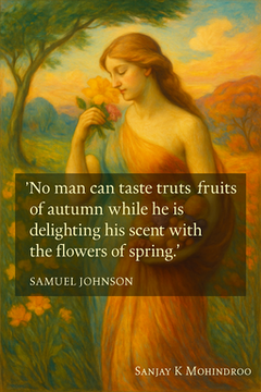 There is a striking line by Samuel Johnson: “No man can taste the fruits of autumn while he is delighting his scent with the flowers of spring.” It speaks with calm force. It tells us that we cannot enjoy the gains of a later season while holding tight to the comfort of an earlier one. The feeling behind the quote is sharp yet honest. It prompts us to reflect on how often we delay our own progress. #GrowthMindset #Leadership #Change